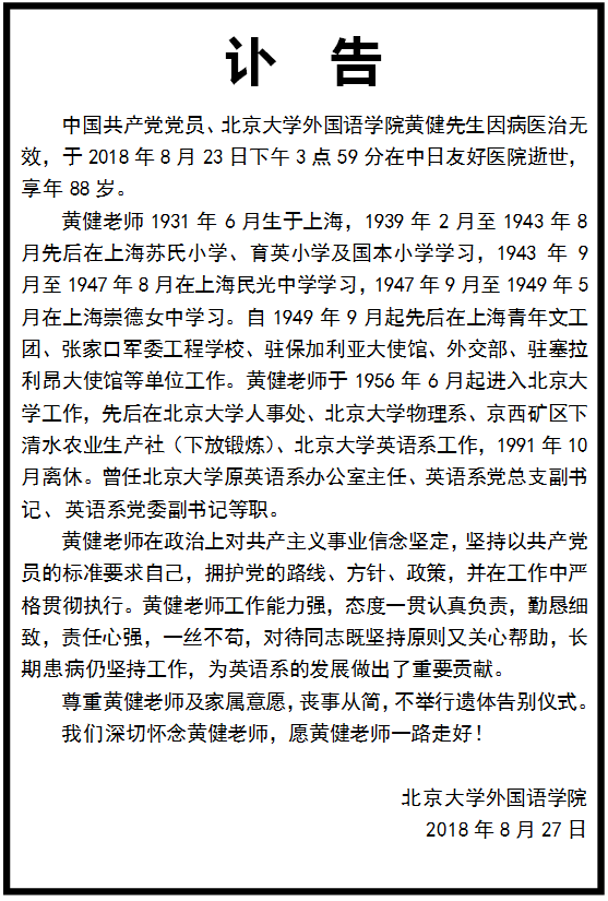 黄健先生讣告